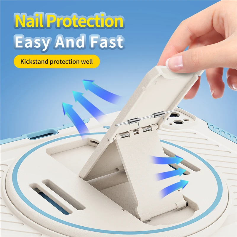 Unique Kickstand Function only one type of 12.9 inch iPad full body rugged protective durable rubber case supports auto kickstand retraction in the market, you only need to lift the kickstand up gently and then free your hand, done to open/close the kickstand, that allows you and your kids use it much convenience.There is a Stylus Pen Holder on the back to store your pen (Pencil is NOT included)