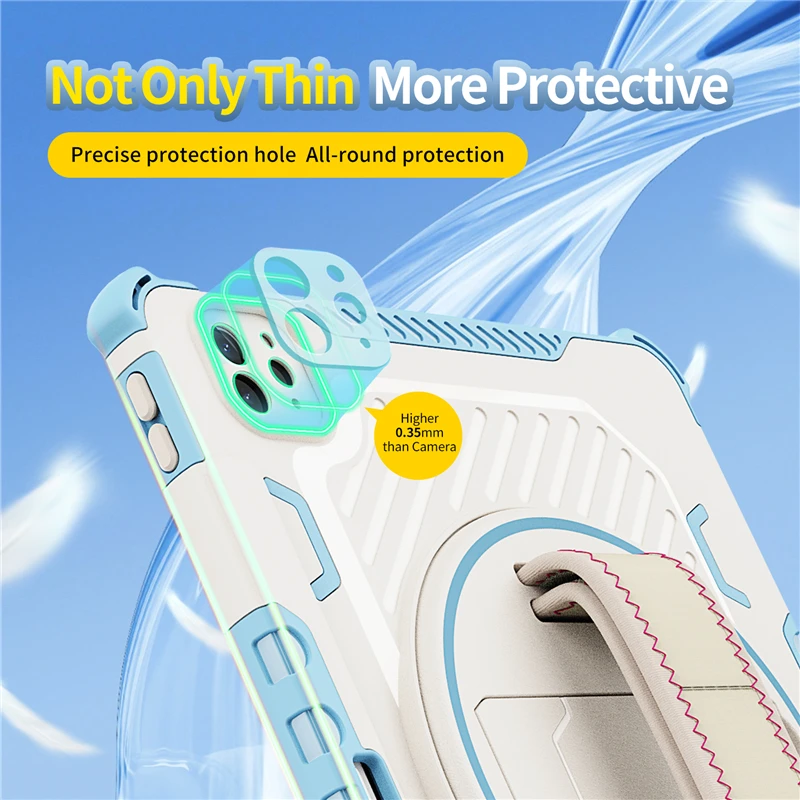 Built-in Screen Protector+Detachable Shoulder Strap. Raised edges on the screen protection + have built in screen protector protection, truly made work to protect screen of iPad pro 12.9 from scratching and breaking. Equip with 59 inches adjustable and detachable shoulder strap, ideal for tour, restaurant order, household products introduce, engineer outside operation, teacher etc, shoulder strap can hung on the back seat in car, create a mini movie theater for your kids